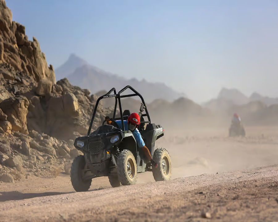 Third day in the Red Sea. Offering a half-day, 4-hour trip to the Eastern Desert (Option). The trip includes morning hotel transfers, a 40-minute quad bike ride, a 20-minute buggy ride, a 4×4 Jeep and camel ride, and a break with tea at a Bedouin tent.